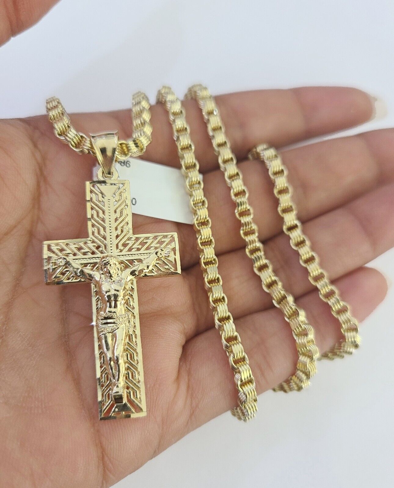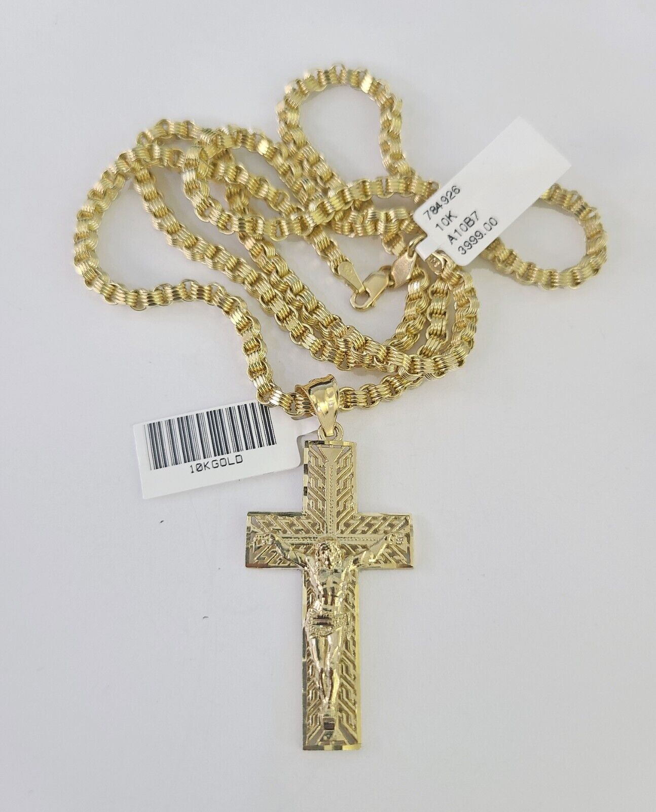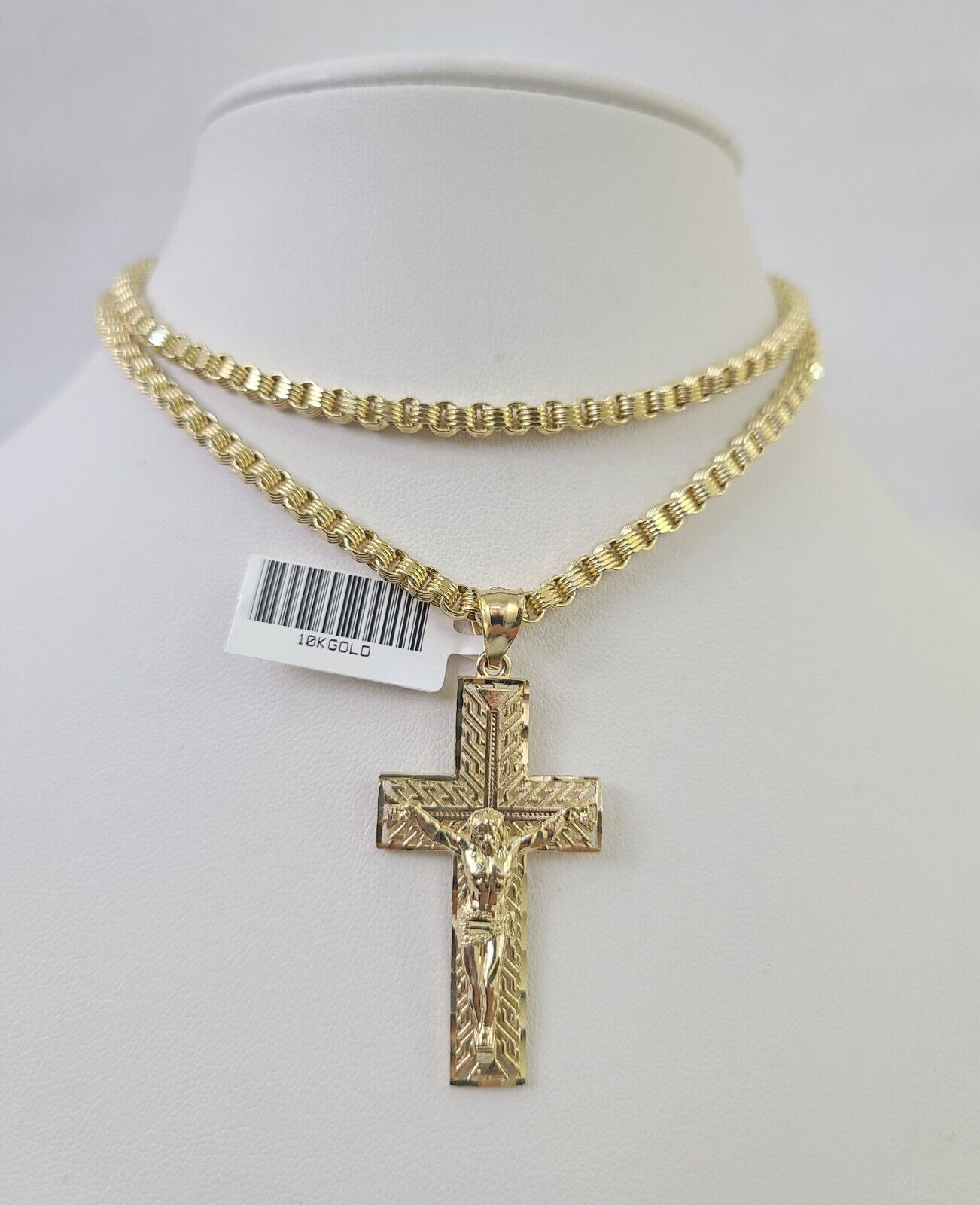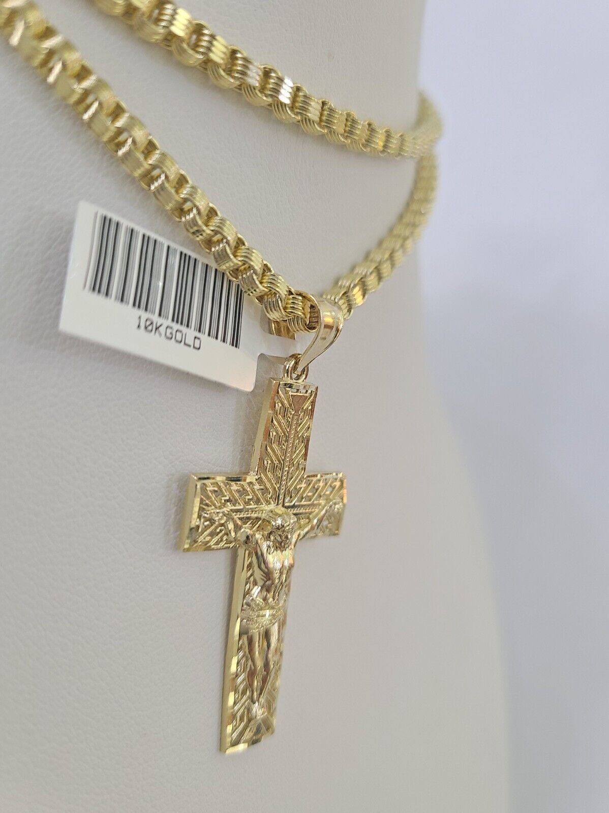 Real 10k Gold Byzantine Necklace Jesus Cross Charm SET Chain 18"-30" 3mm Pendant