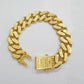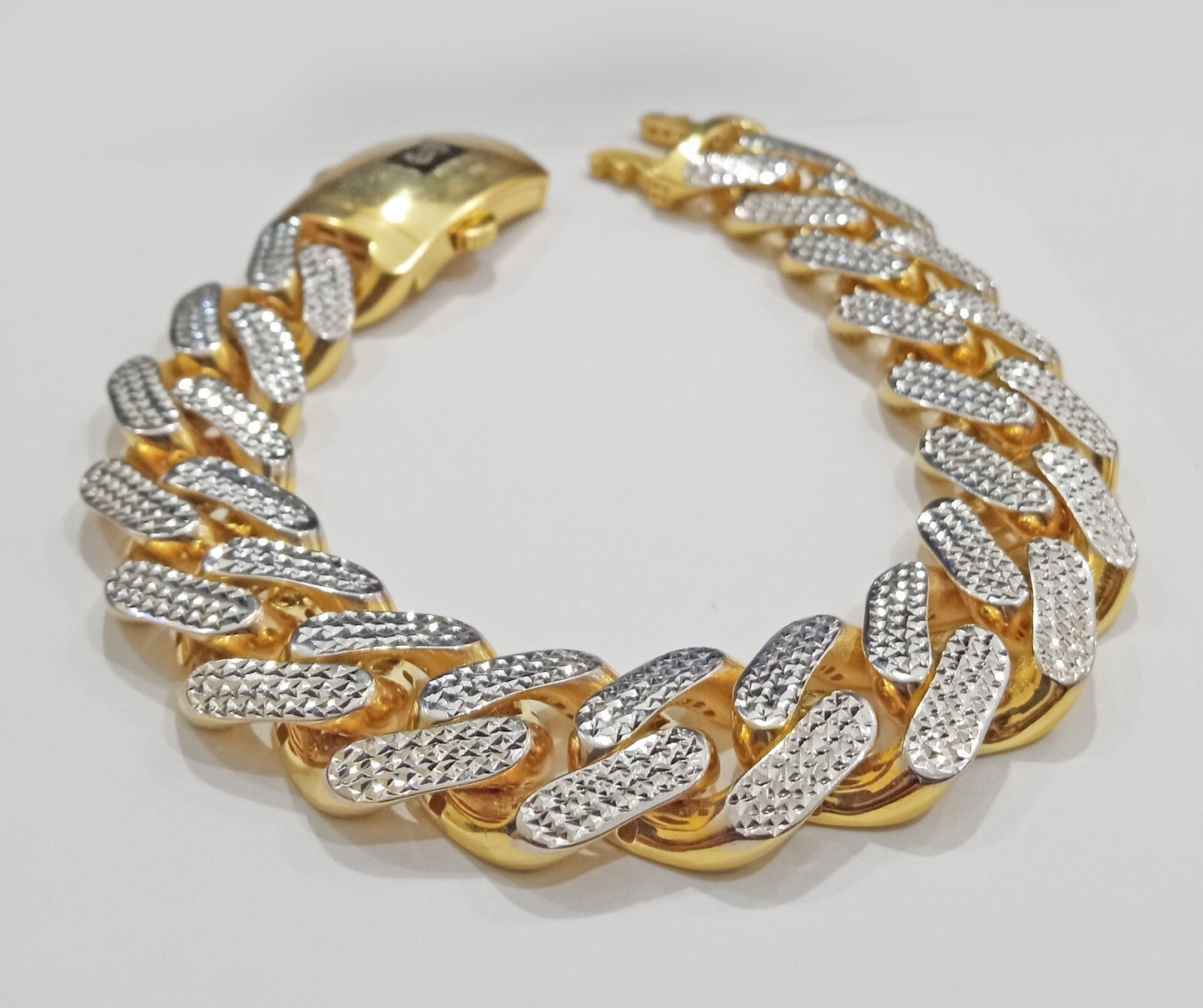 10 k Yellow Gold ( Real , Not plated , Not filled ) Monaco link bracelet, rhodium Diamond Cuts For men's . The Width of the bracelet is 17 MM and 9 Inches Long. The Clasp is Box Lock. The bracelet is considered durable. The bracelet is 100% guaranteed 10k yellow gold and have been professionally tested and stamped 10k for purity authenticity. The bracelet feels light weight because of its make being hollow but We guarantee the purity of the gold to be 10k, and the bracelets are NOT GOLD PLATED, NOT FILLED. If you are not happy with the way it looks or feels, we do offer FREE Return shipping. C28D3E
