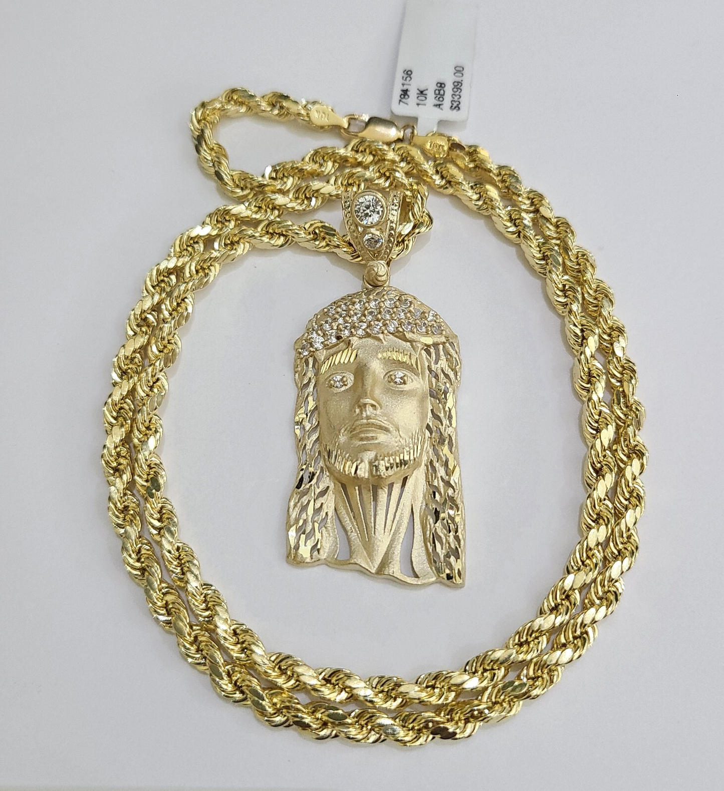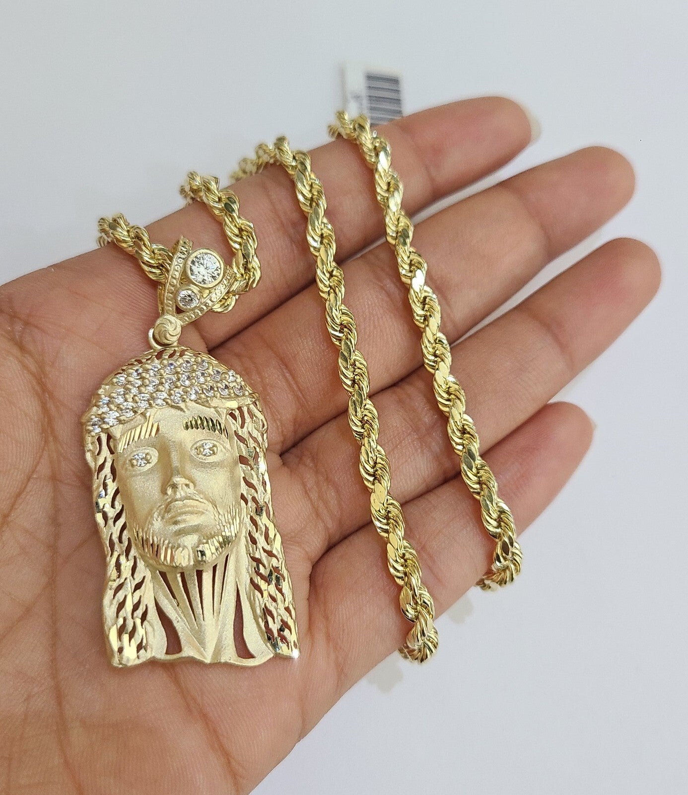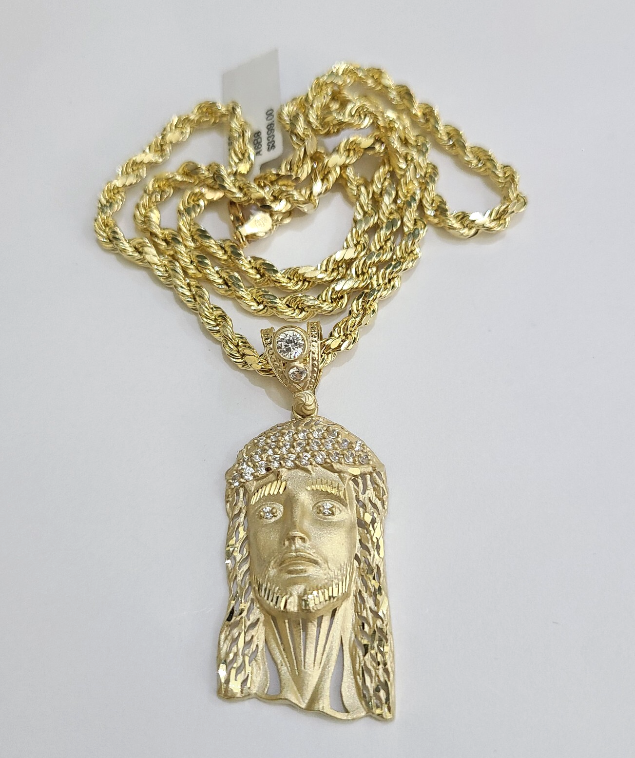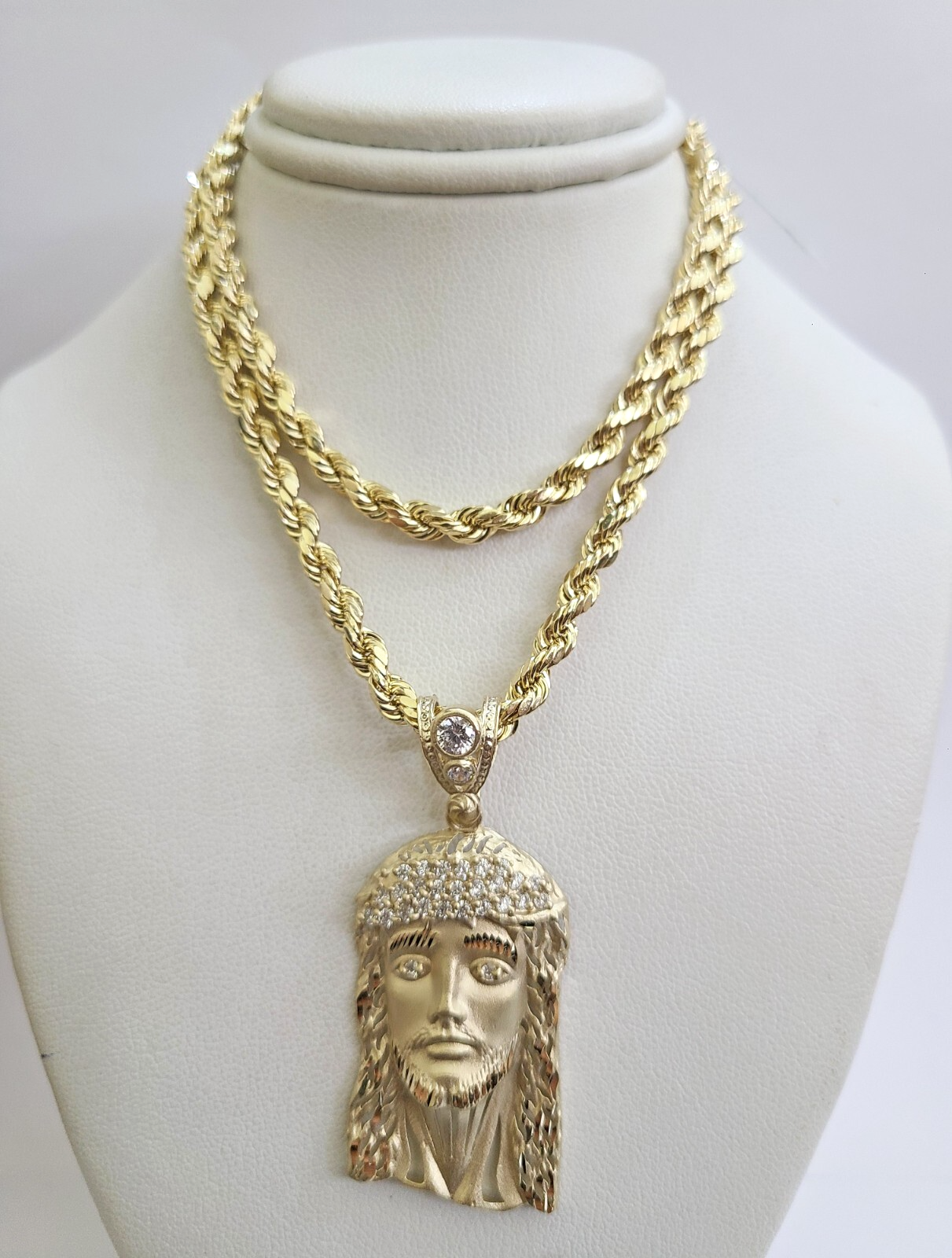 REAL 10k Jesus Head Charm Rope Chain Pendant 4mm Necklace Set 18"-28" in
