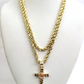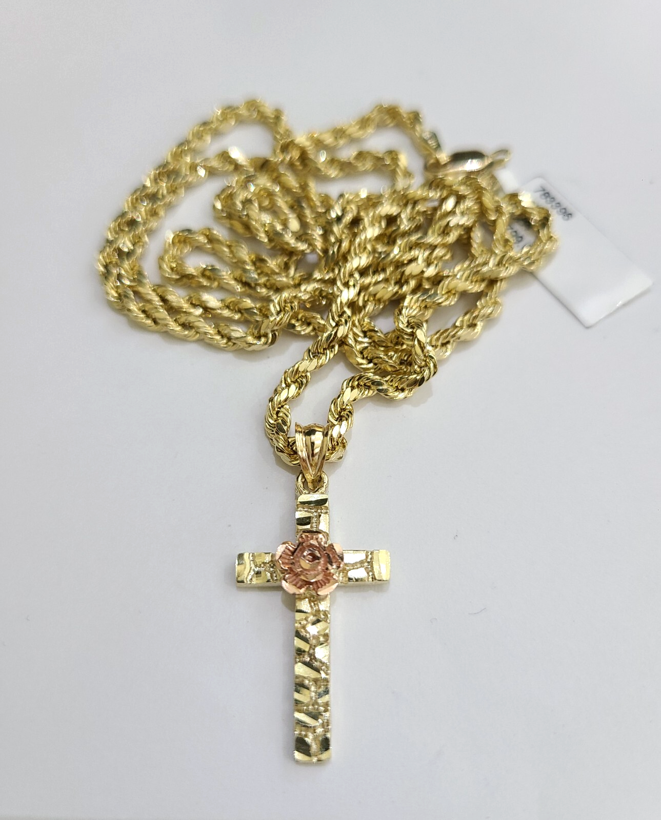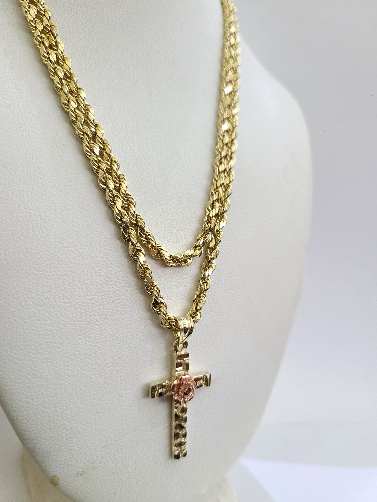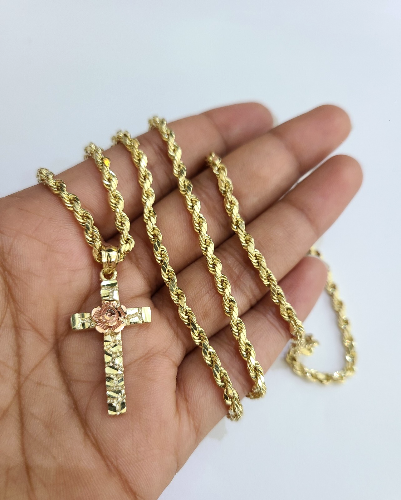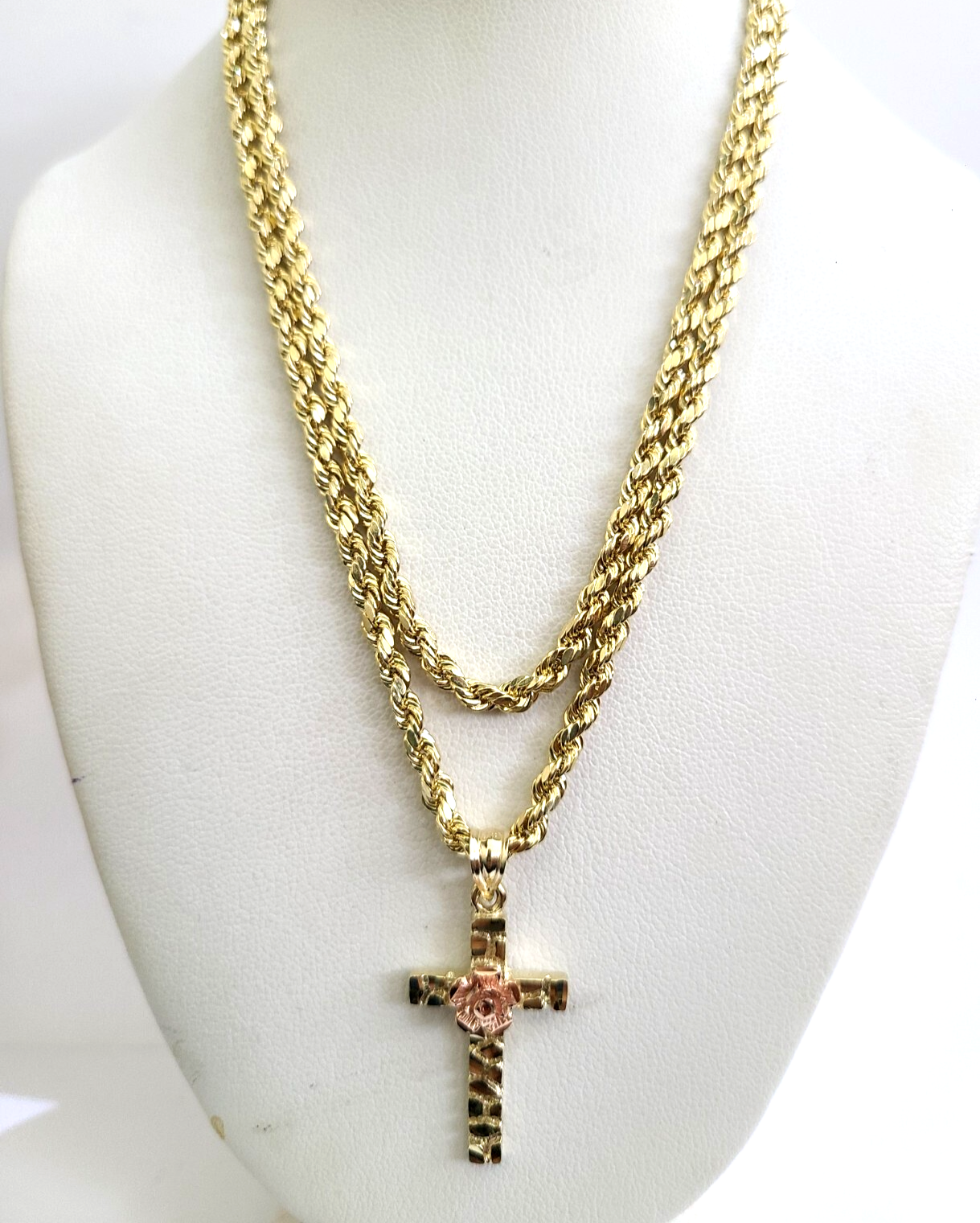 REAL 10k Rope Chain Jesus Rose Cross Charm Pendant 3mm Necklace Set 18"-28"