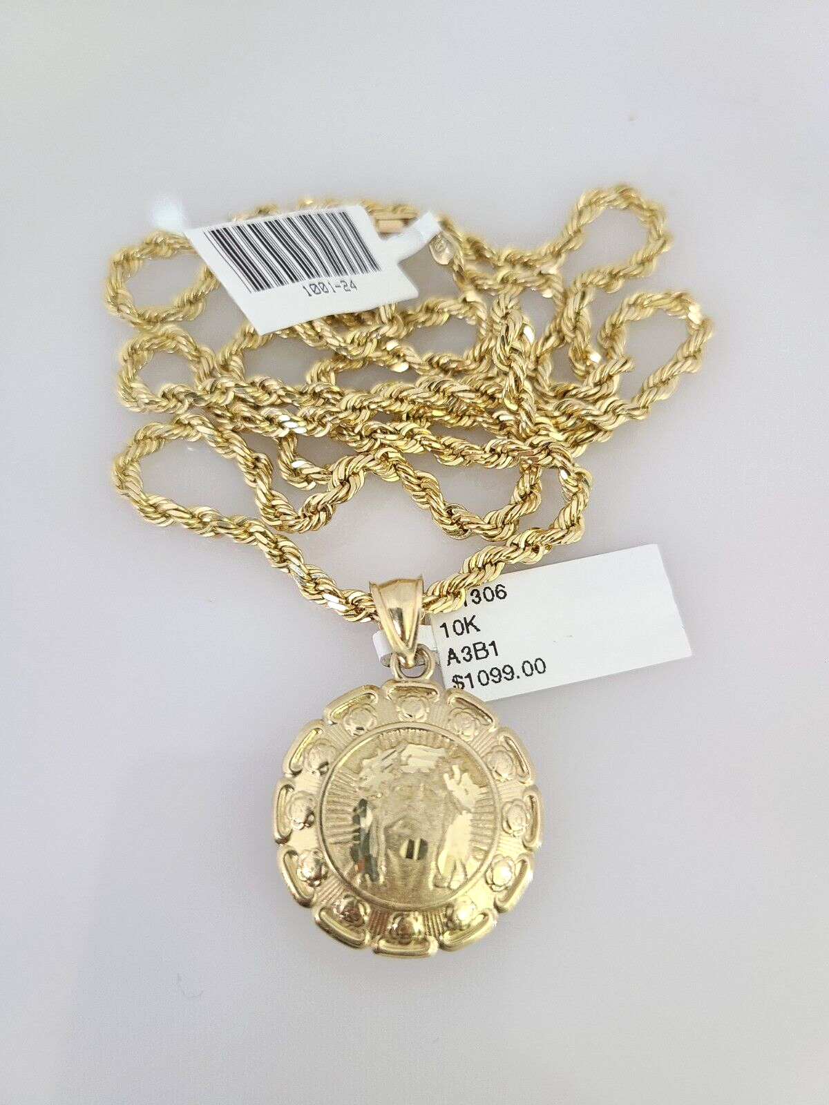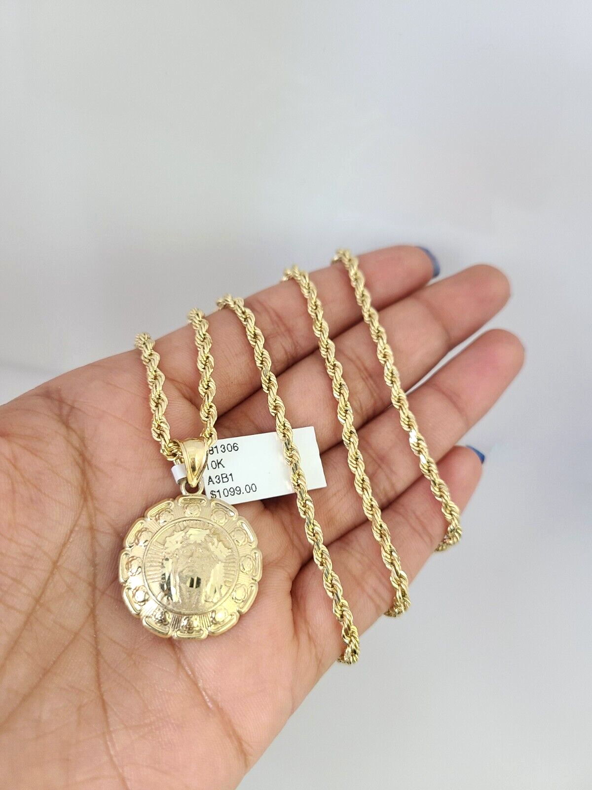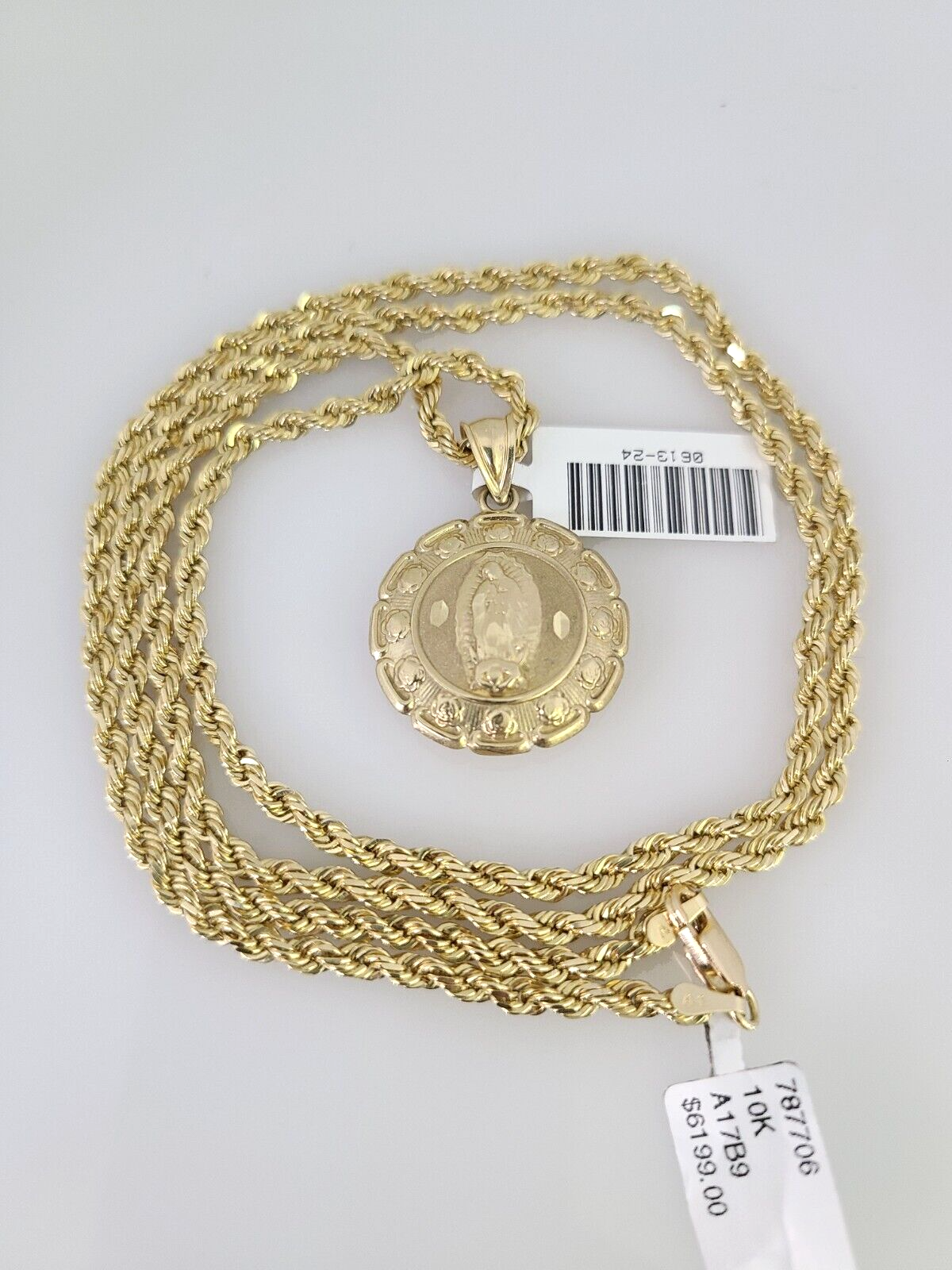 REAL 10k Solid Rope Chain Virgin Mary Jesus Charm Pendant 3mm Set 18"-26" in