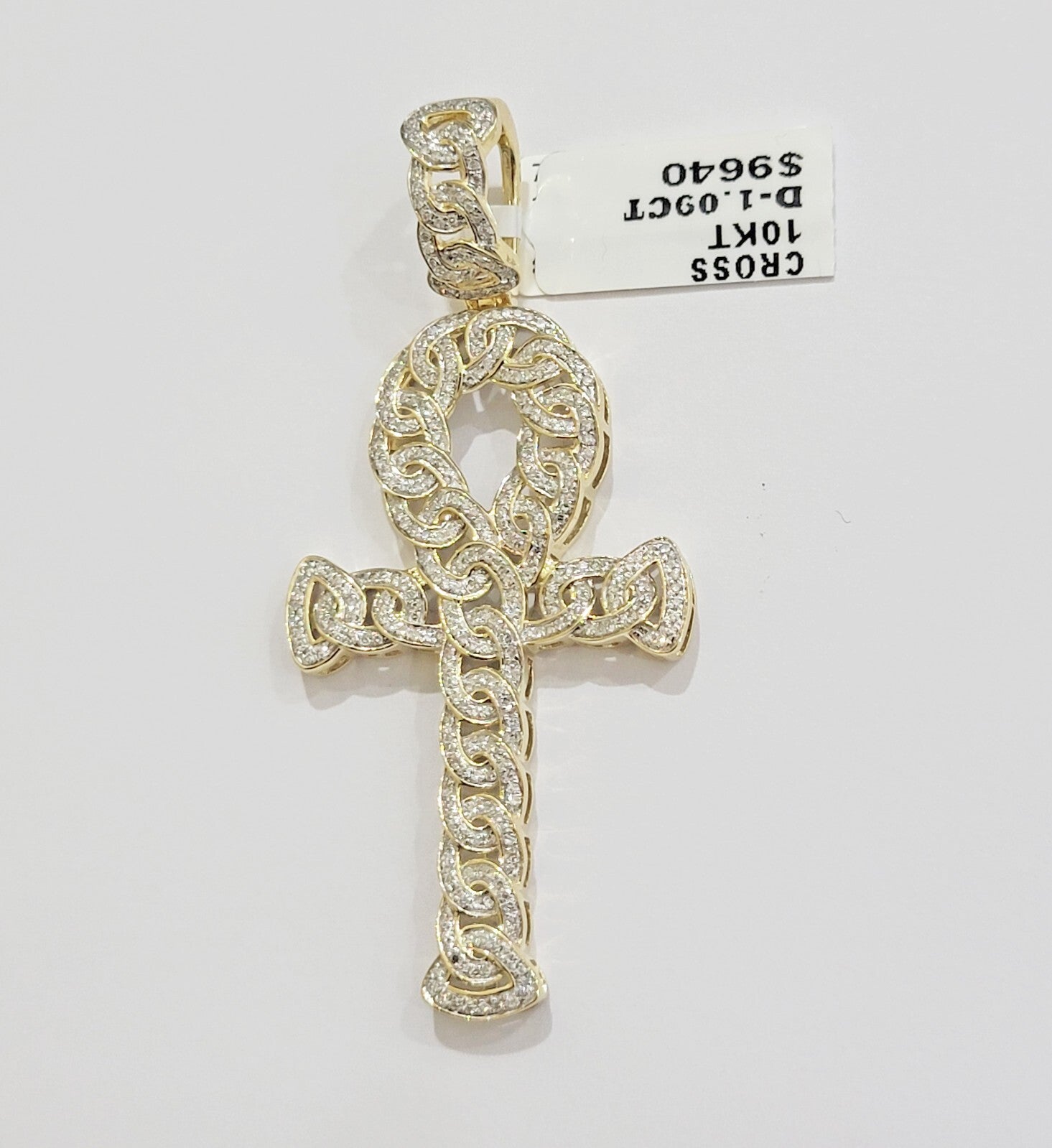 Real 10k Yellow Gold Diamond Ankh Cross Charm Pendant 1.08 CT Mens 2.5Inch