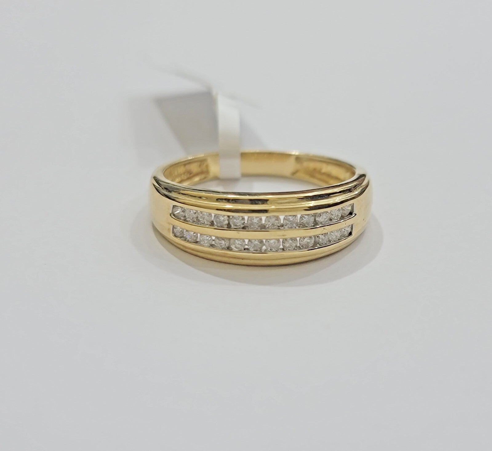 Real 14 K Yellow Gold / white gold and Real 0.40 CT Diamond Channel Set Wedding/ Engagement Ring for Men's. It has Round Diamonds, Very Good Quality Diamonds SI1-SI2. The Diamonds are Good Cut. The shape of the diamond Ring is Round, Traditional and Classic & Timeless. It comes with standard size 10, and the ring is sizable. Sizing the ring will cost you extra $29.99 on your demand.