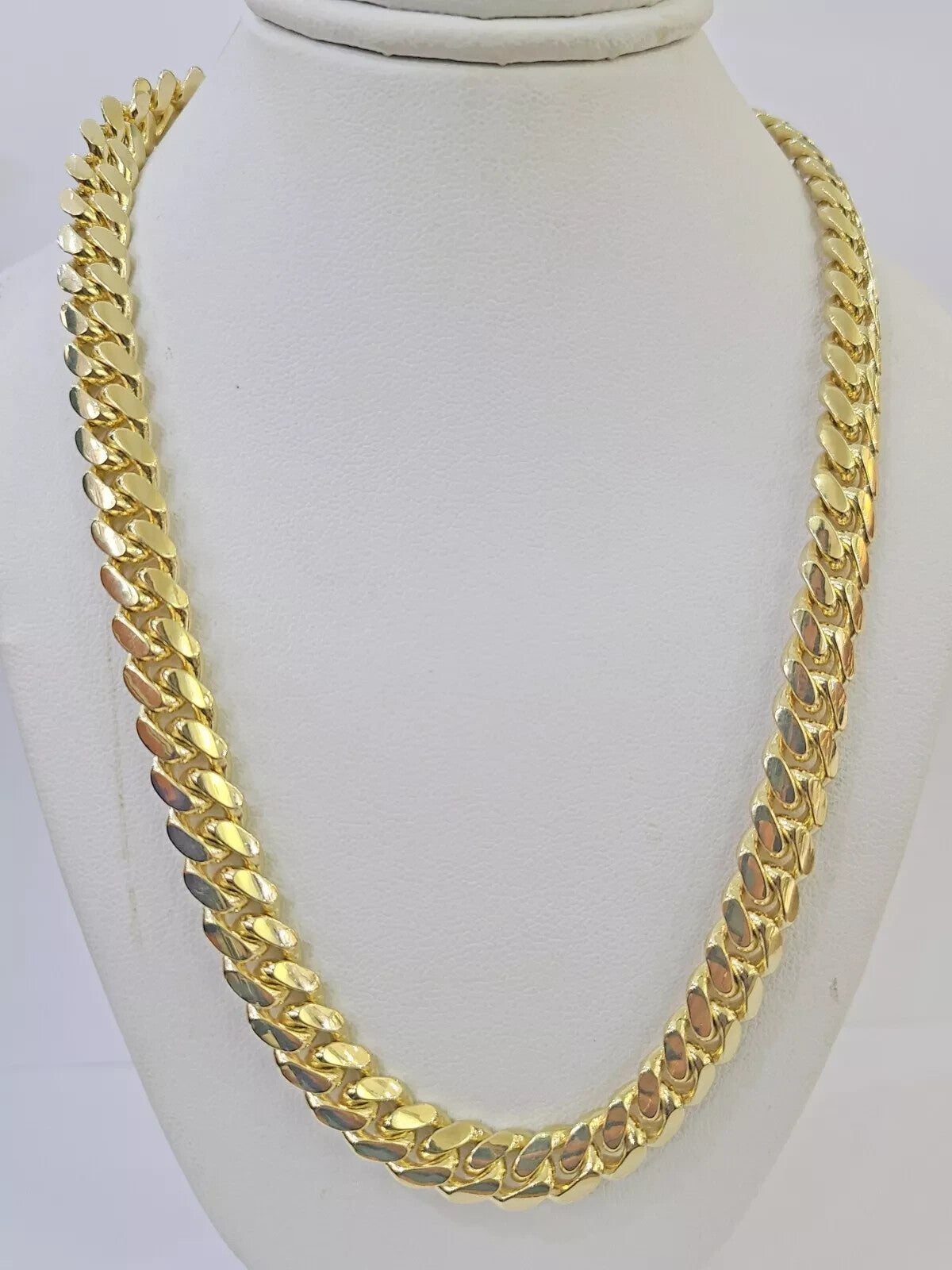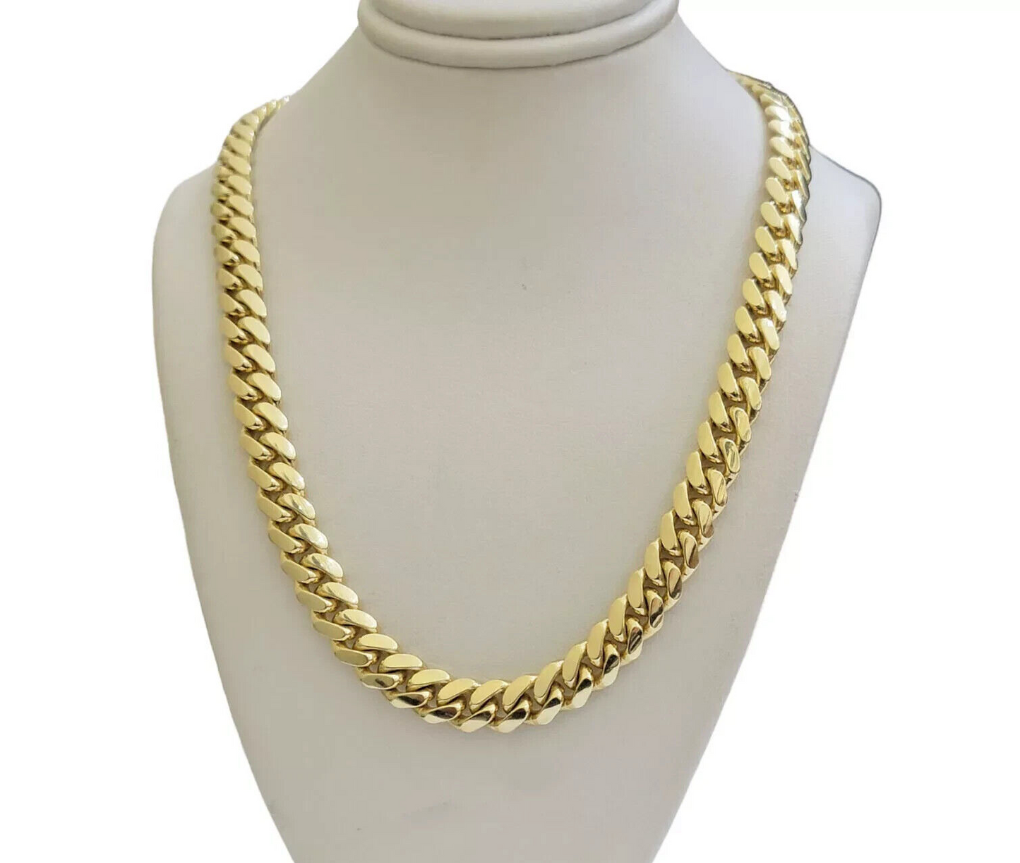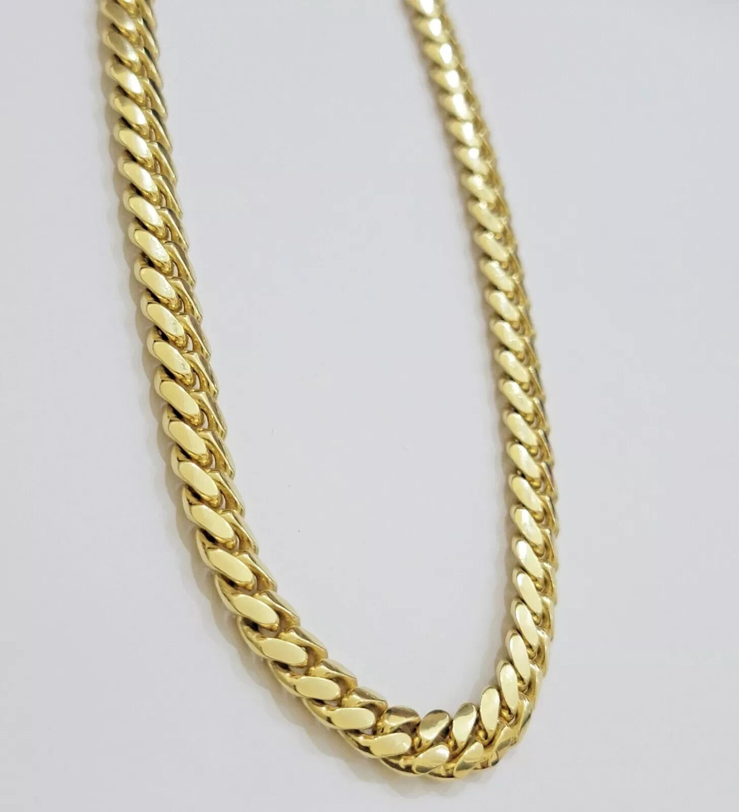 SOLID ( Heavy) 10 K Yellow Gold ( Real , Not plated , Not filled ) Miami Cuban-Link 8mm Chain For Men's . The length is 24 Inch Long and Width of the Necklace is 8 mm ( approx.) . The Clasp is box Lock with two other safety clasp in sides which is strong. The chain is beautiful designed with Cuban-Link style. If you are not happy with the way it looks or feels, we do offer 30 - Days FREE Return shipping.