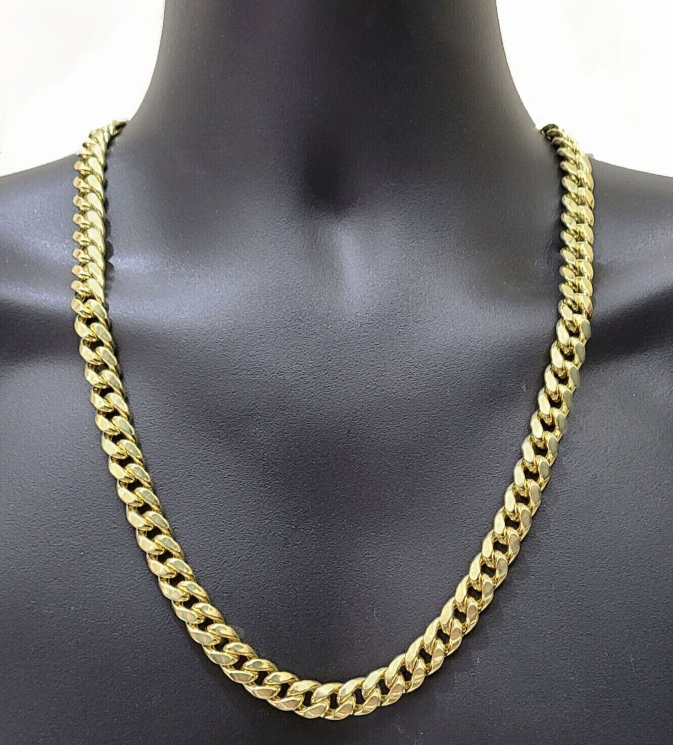 14 k Yellow Gold ( Real , Not plated , Not filled ) Miami Cuban link chain For men's . The Width of the necklace is 9MM and 28 Inches. The Clasp is Box Lock. The necklace is 100% guaranteed 14k yellow gold and have been professionally tested and stamped 14k for purity authenticity. We guarantee the purity of the gold to be 14k, and the chains are NOT GOLD PLATED, NOT FILLED. These necklaces are strong and steady and are not easily broken. The chain is considered durable. If you are not happy with the way it looks or feels, we do offer 30 - Days FREE Return shipping. AG