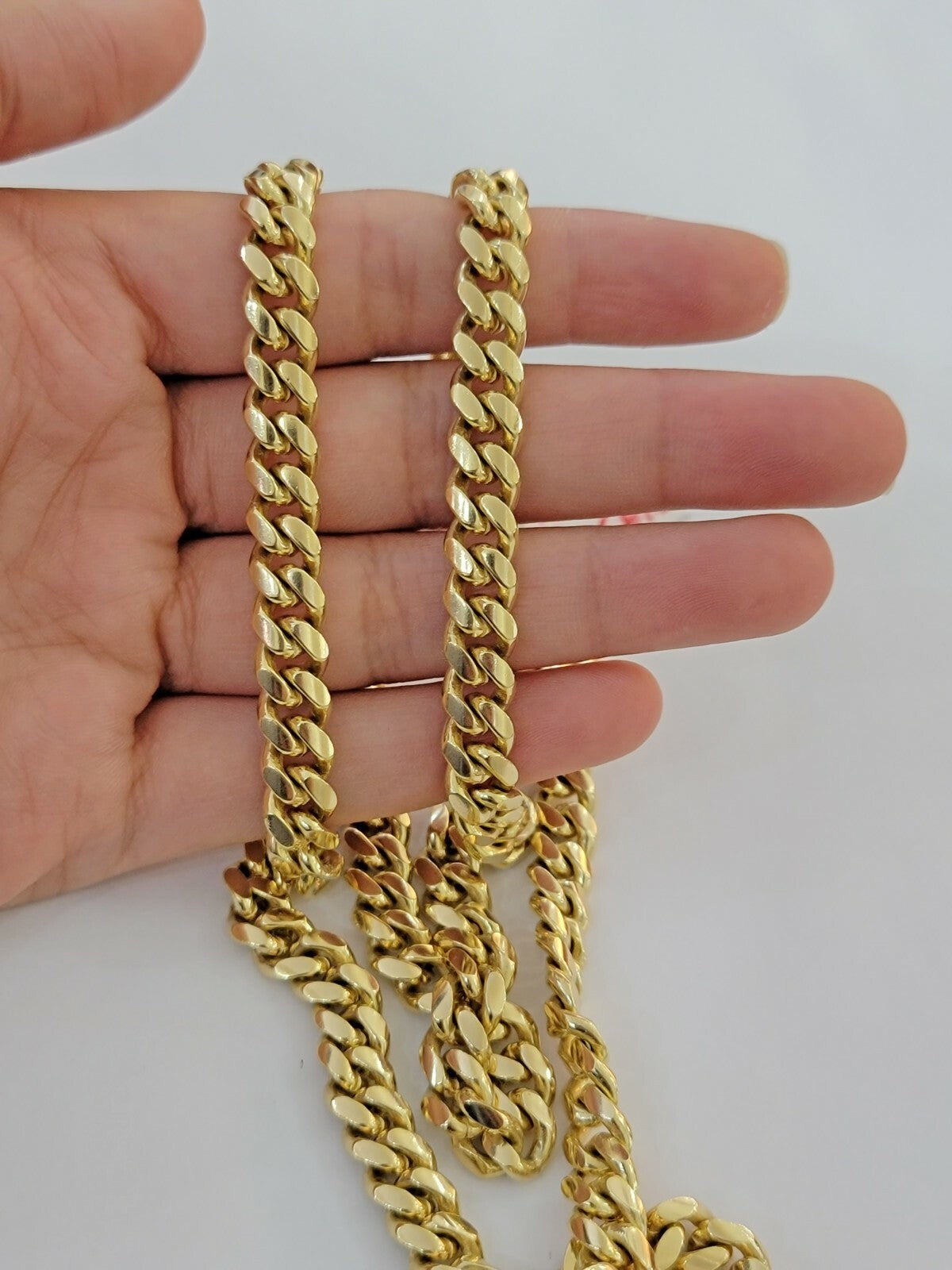 SOLID ( Heavy) 14 K Yellow Gold ( Real , Not plated , Not filled ) Miami Cuban-Link 8mm Chain For Men's . The length is 26 Inch Long and Width of the Necklace is 8 mm ( approx.) . The Clasp is box Lock with two other safety clasp in sides which is strong. The chain is beautiful designed with Cuban-Link style. If you are not happy with the way it looks or feels, we do offer 30 - Days FREE Return shipping.