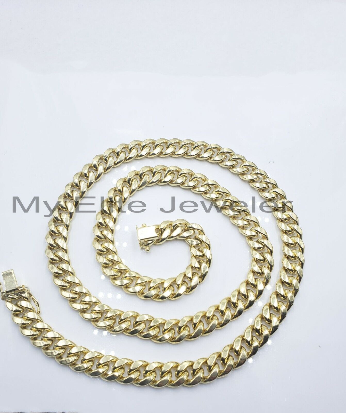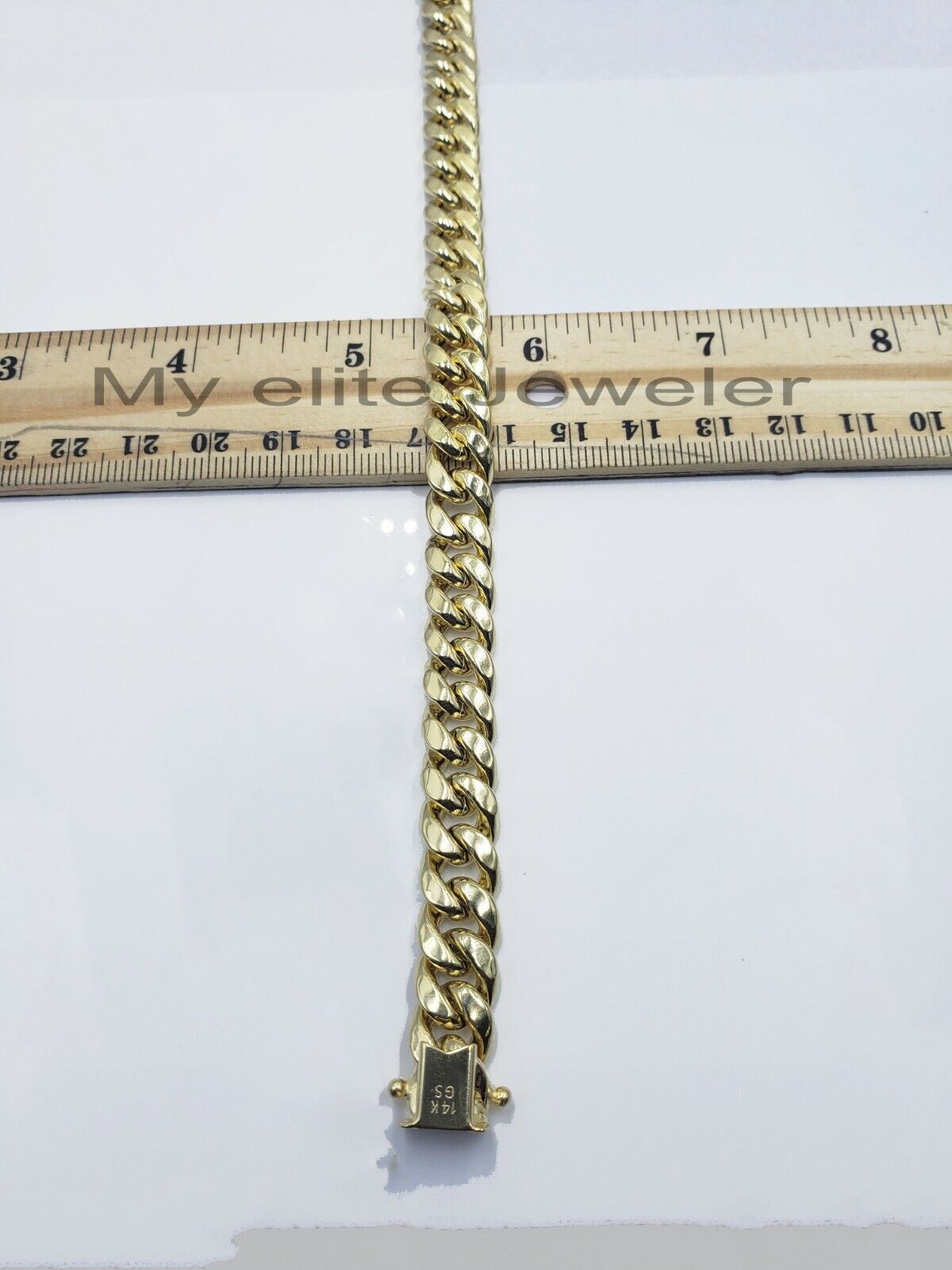 14 k Yellow Gold ( Real , Not plated , Not filled ) Miami Cuban link chain For men's . The Width of the necklace is 9/10 MM and 24 Inches Long. The Clasp is Box Lock. The necklace is 100% guaranteed 14k yellow gold and have been professionally tested and stamped 14k for purity authenticity. We guarantee the purity of the gold to be 14k, and the chains are NOT GOLD PLATED, NOT FILLED. These necklaces are strong and steady and are not easily broken. The chain is considered durable. If you are not happy with the way it looks or feels, we do offer 30 - Days FREE Return shipping.