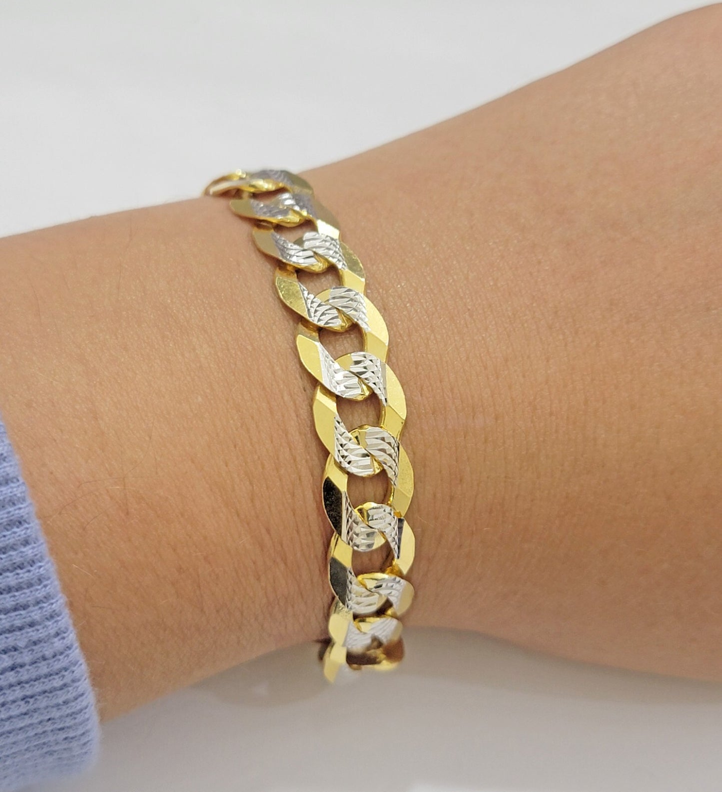 14 k Solid Gold Miami Cuban Curb Link Bracelet. The Width of the Bracelet is 11 MM and Length is 9 Inches. The Clasp is lobster. The Bracelet is considered very durable. The necklace is 100% guaranteed 14k yellow gold and have been professionally tested and stamped 14k for purity authenticity. We guarantee the purity of the gold to be 14k, and these are NOT GOLD PLATED, NOT FILLED. These necklaces are strong and steady and are not easily broken. Therefore it is very safe to wear it on daily basis.