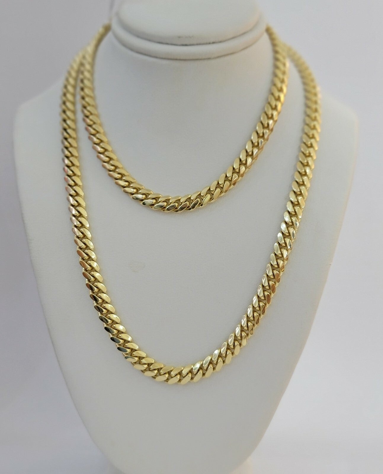 Solid 10KT Yellow Gold ( Real , Not plated , Not filled ) Miami Cuban Cuban Link chain. The Width of the necklace is 6 MM in Length 22 Inches. The Clasp is Box Lock. The chain is considered durable because is is Heavy Solid with approximately 49-51 grams . The necklace is 100% guaranteed 10k yellow gold and have been professionally tested and stamped 10k for purity authenticity. The chain feels light weight because of its make being hollow but We guarantee the purity of the gold to be 10k, and the chains are NOT GOLD PLATED, NOT FILLED. If you are not happy with the way it looks or feels, we do offer