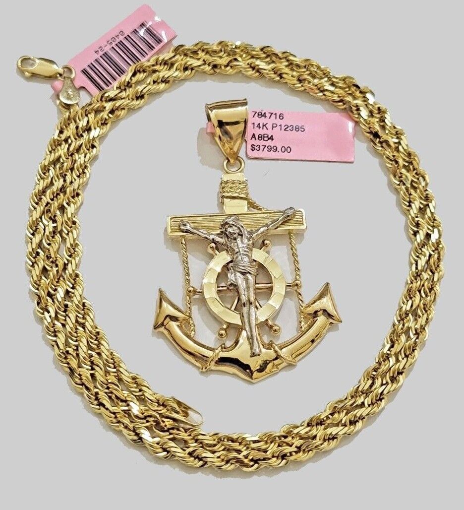 Solid 14k Gold Rope Chain Necklace Jesus Anchor Charm Pendant 28 Inches 4mm SALE